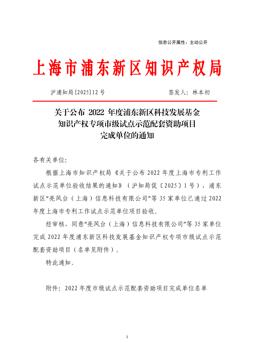 ??經(jīng)審核,同意“亮風臺(上海)信息科技有限公司”等35家單位完成2022年度浦東新區(qū)科技發(fā)展基金知識產(chǎn)權(quán)專項市級試點示范配套資助項目(名單見附件)。
