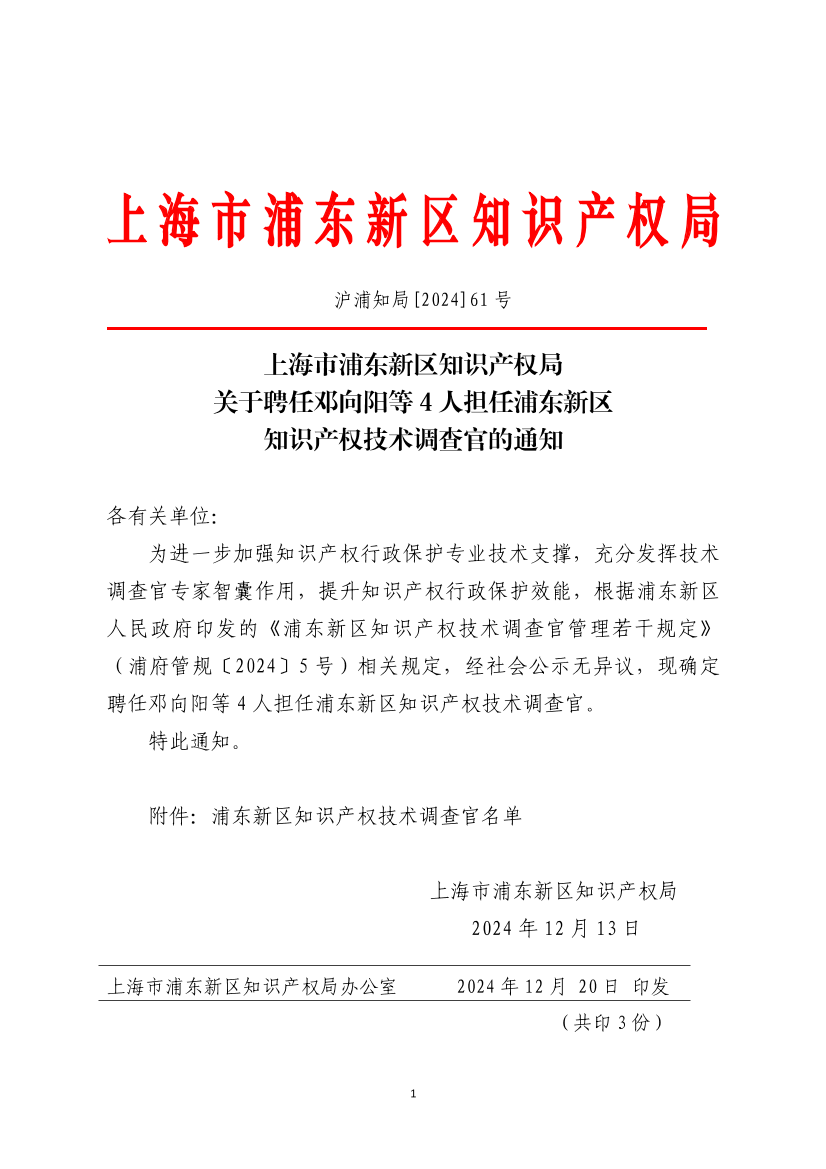??為進一步加強知識產(chǎn)權(quán)行政保護專業(yè)技術(shù)支撐,充分發(fā)揮技術(shù)調(diào)查官專家智囊作用,提升知識產(chǎn)權(quán)行政保護效能,根據(jù)浦東新區(qū)人民政府印發(fā)的《浦東新區(qū)知識產(chǎn)權(quán)技術(shù)調(diào)查官管理若干規(guī)定》(浦府管規(guī)〔2024〕5號)相關(guān)規(guī)定,經(jīng)社會公示無異議,現(xiàn)確定聘任鄧向陽等4人擔(dān)任浦東新區(qū)知識產(chǎn)權(quán)技術(shù)調(diào)查官。
