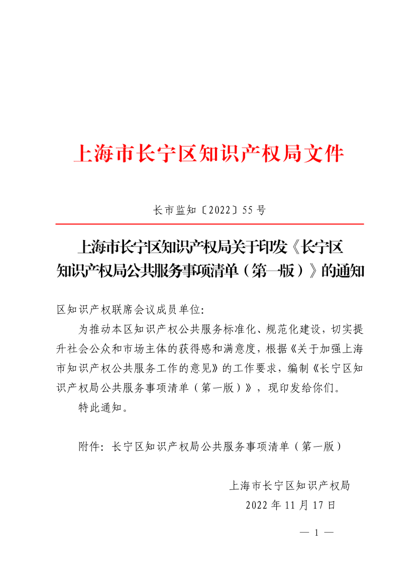 關(guān)于印發(fā)《長寧區(qū)知識產(chǎn)權(quán)局公共服務(wù)事項清單(第一版)》的通知