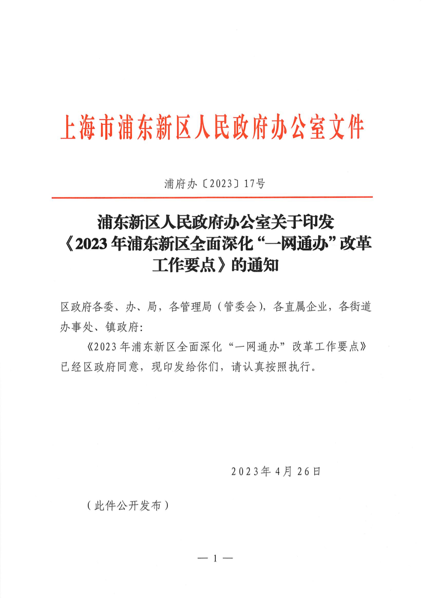 浦東新區(qū)人民政府辦公室關(guān)于印發(fā)《2023年浦東新區(qū)全面深化“一網(wǎng)通辦”改革工作要點》的通知