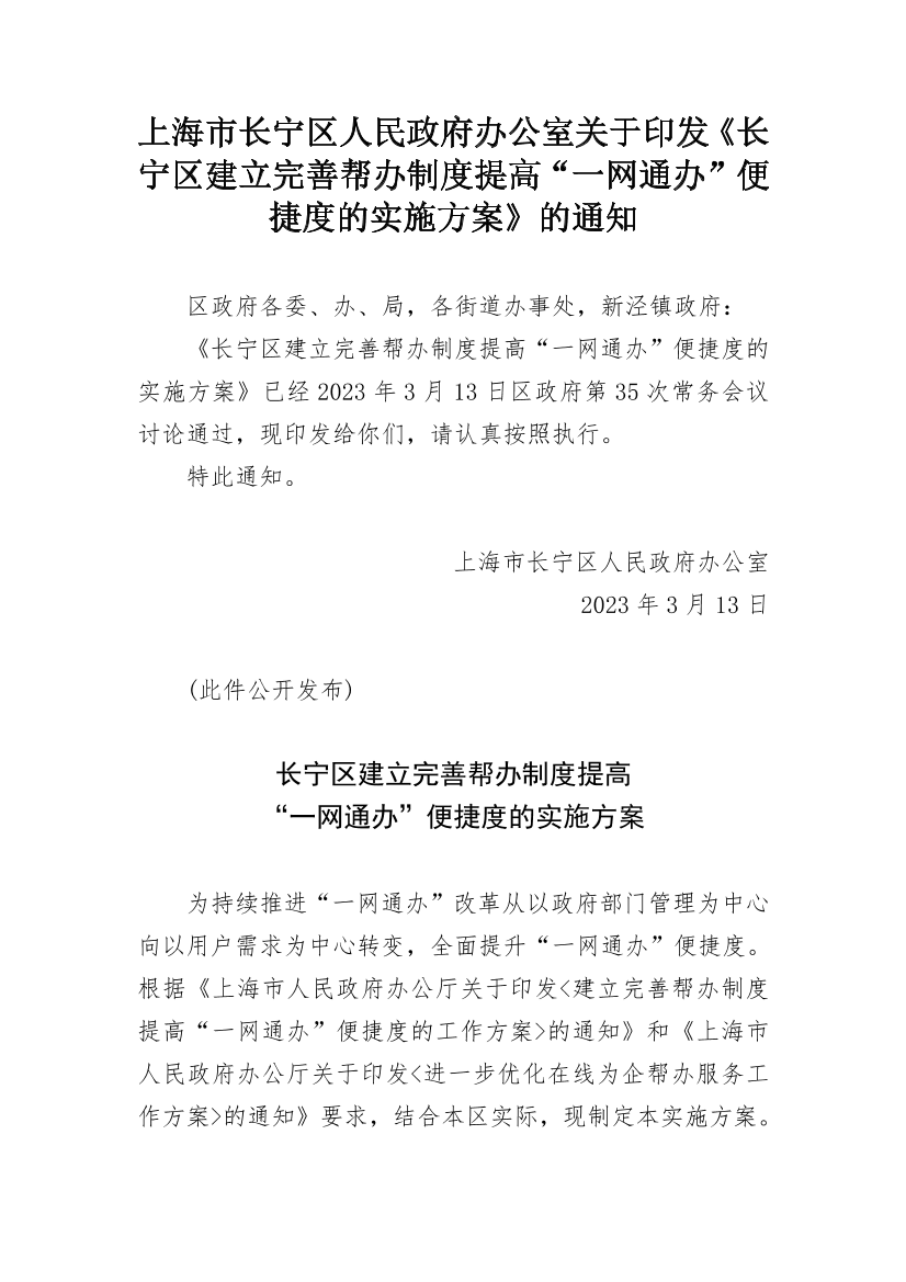??《長寧區(qū)建立完善幫辦制度提高“一網(wǎng)通辦”便捷度的實(shí)施方案》已經(jīng)2023年3月13日區(qū)政府第35次常務(wù)會議討論通過,現(xiàn)印發(fā)給你們,請認(rèn)真按照執(zhí)行。