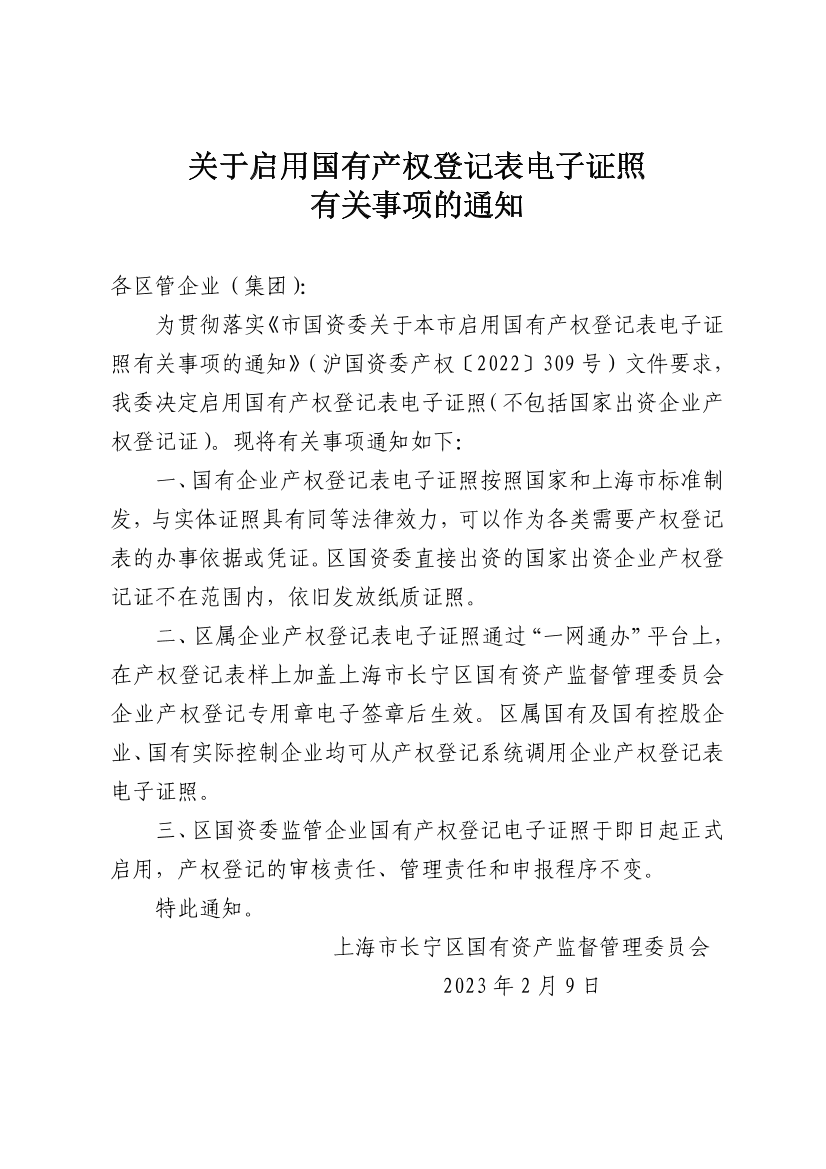 ??為貫徹落實《市國資委關(guān)于本市啟用國有產(chǎn)權(quán)登記表電子證照有關(guān)事項的通知》(滬國資委產(chǎn)權(quán)〔2022〕309號)文件要求,我委決定啟用國有產(chǎn)權(quán)登記表電子證照(不包括國家出資企業(yè)產(chǎn)權(quán)登記證)?,F(xiàn)將有關(guān)事項通知如下:
