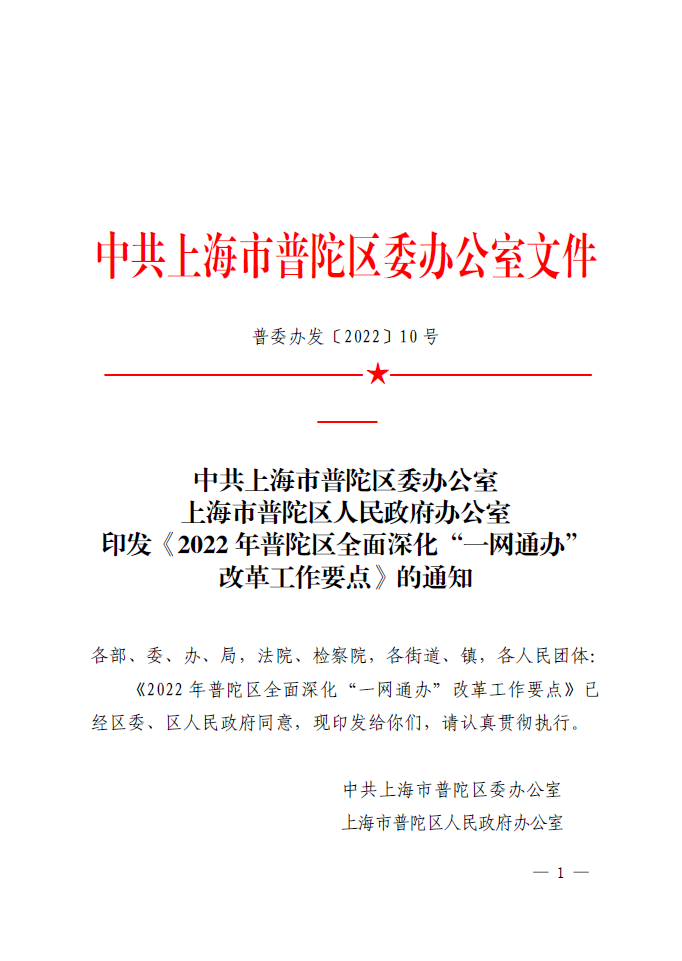 ??《2022年普陀區(qū)全面深化“一網(wǎng)通辦”改革工作要點》已經(jīng)區(qū)委、區(qū)人民政府同意,現(xiàn)印發(fā)給你們,請認(rèn)真貫徹執(zhí)行。