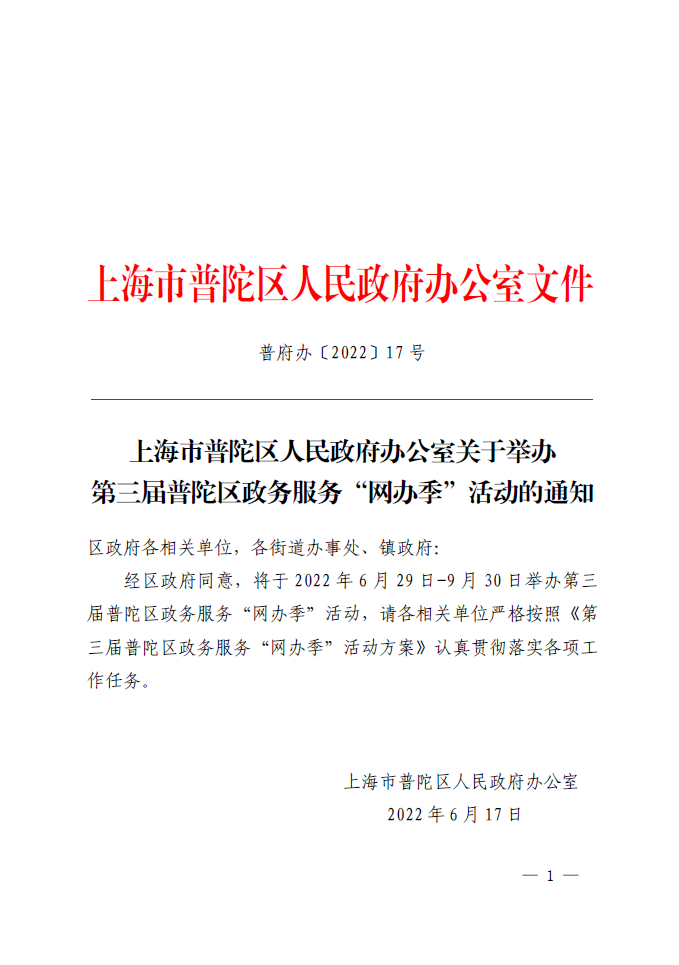 ??經(jīng)區(qū)政府同意,將于2022年6月29日-9月30日舉辦第三屆普陀區(qū)政務(wù)服務(wù)“網(wǎng)辦季”活動,請各相關(guān)單位嚴(yán)格按照《第三屆普陀區(qū)政務(wù)服務(wù)“網(wǎng)辦季”活動方案》認(rèn)真貫徹落實各項工作任務(wù)。