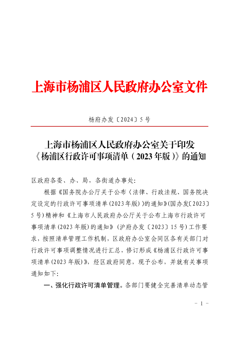??根據(jù)《國務(wù)院辦公廳關(guān)于公布〈法律、行政法規(guī)、國務(wù)院決定設(shè)定的行政許可事項清單(2023年版)〉的通知》(國辦發(fā)〔2023〕5號)精神和《上海市人民政府辦公廳關(guān)于公布上海市行政許可事項清單(2023年版)的通知》(滬府辦發(fā)〔2023〕15號)工作要求,按照清單管理工作機制,區(qū)政府辦公室會同區(qū)各有關(guān)部門對行政許可事項調(diào)整情況進行匯總,修訂形成《楊浦區(qū)行政許可事項清單(2023年版)》,經(jīng)區(qū)政府同意,現(xiàn)予公布,并就有關(guān)事項通知如下:
