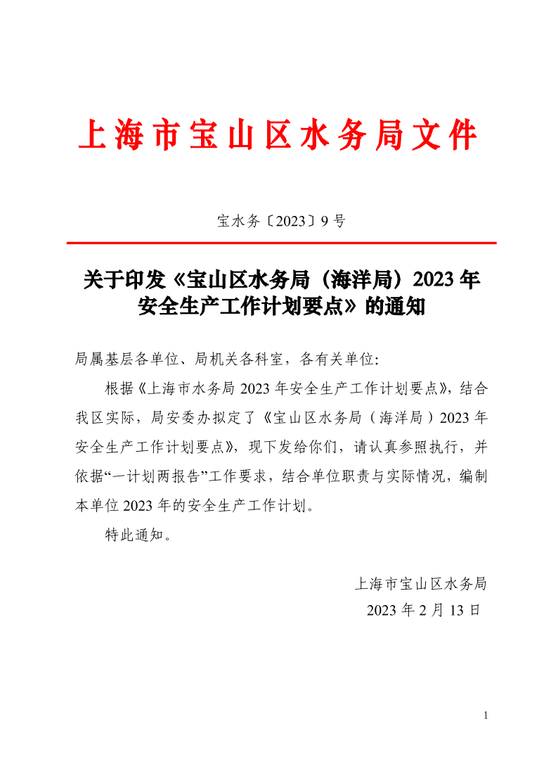 ??根據(jù)《上海市水務(wù)局2023年安全生產(chǎn)工作計劃要點》,結(jié)合我區(qū)實際,局安委辦擬定了《寶山區(qū)水務(wù)局(海洋局)2023年安全生產(chǎn)工作計劃要點》,現(xiàn)下發(fā)給你們,請認真參照執(zhí)行,并依據(jù)“一計劃兩報告”工作要求,結(jié)合單位職責與實際情況,編制本單位2023年的安全生產(chǎn)工作計劃。