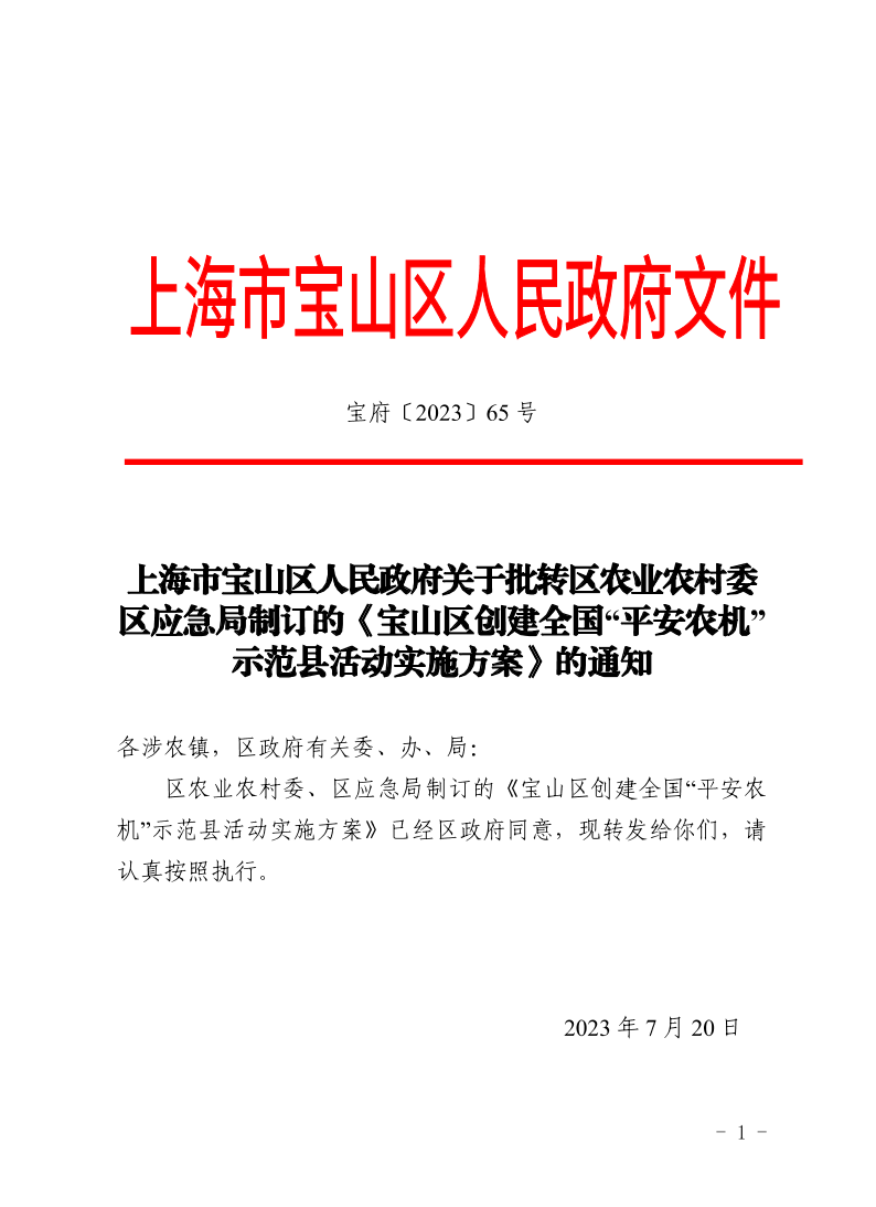 ??區(qū)農(nóng)業(yè)農(nóng)村委、區(qū)應(yīng)急局制訂的《寶山區(qū)創(chuàng)建全國“平安農(nóng)機”示范縣活動實施方案》已經(jīng)區(qū)政府同意,現(xiàn)轉(zhuǎn)發(fā)給你們,請認真按照執(zhí)行。
