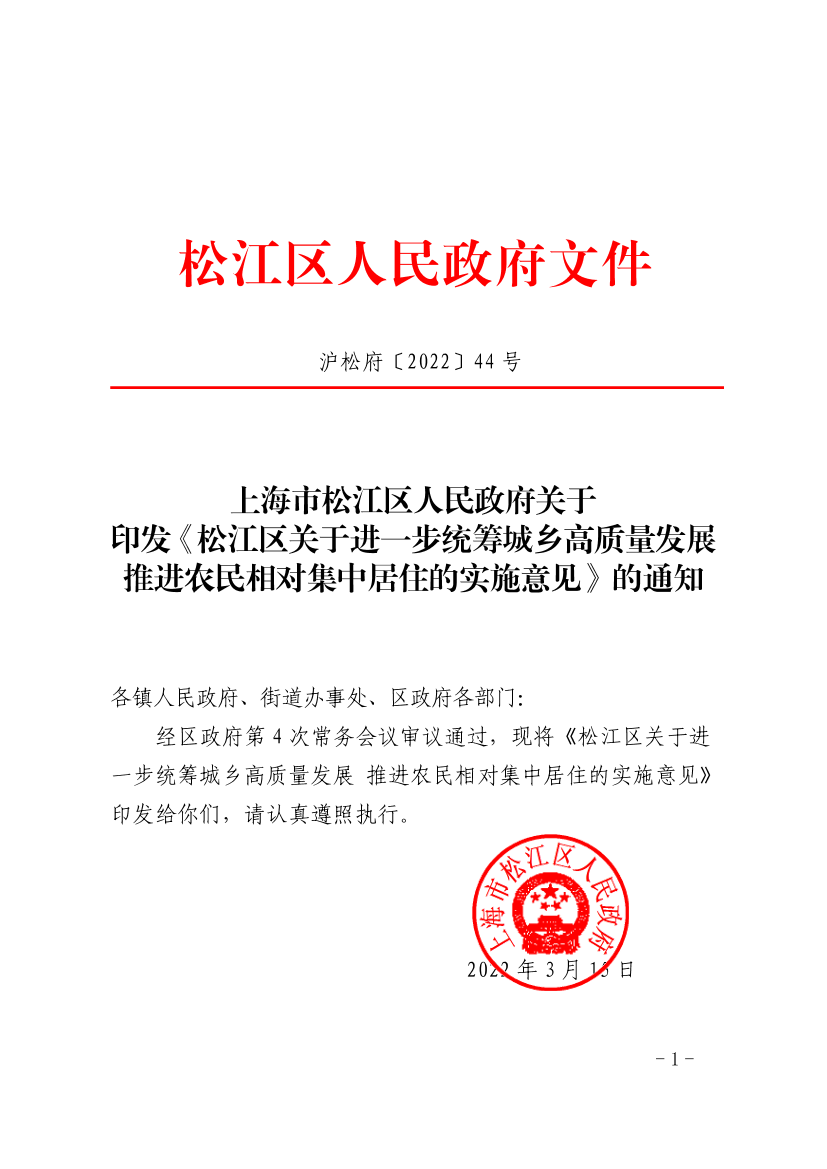 關(guān)于印發(fā)《松江區(qū)關(guān)于進一步統(tǒng)籌城鄉(xiāng)高質(zhì)量發(fā)展推進農(nóng)民相對集中居住的實施意見》的通知